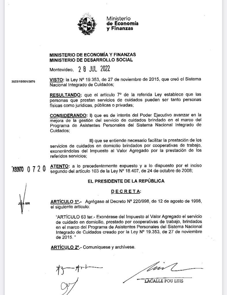 El Poder Ejecutivo resolvió exonerar el IVA a cooperativas de trabajo que prestan servicio de cuidados en domicilios a través del Programa de Asistentes Personales del Sistema Nacional de Cuidados.